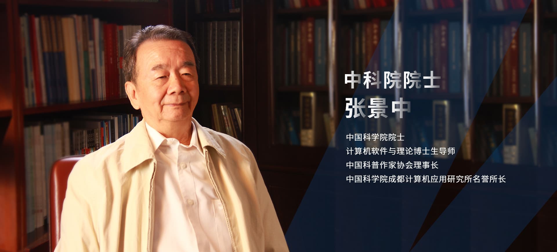 張景中,中國科學院院士,1959年畢業于北京大學數學力學系。從事計算機科學、數學和數學教育研究。《計算機應用》期刊主編。在機器證明、教育數學、距離幾何及動力系統等領域有貢獻。其成果1982年獲國家發明獎二等獎,1995年獲中科院自然科學獎一等獎和中國圖書獎,1997年獲國家自然科學獎二等獎,2003年獲全國科普創作獎一等獎、五個一工程獎和國家圖書獎,2005年和2009年兩次獲國家科技進步獎二等獎。他提出了三角、幾何、代數相互滲透的初等數學教學體系;提出了非ε語言的極限概念表述和實數理論的連續歸納法;發現了不用極限或無窮小建立微積分的基本理論和方法。